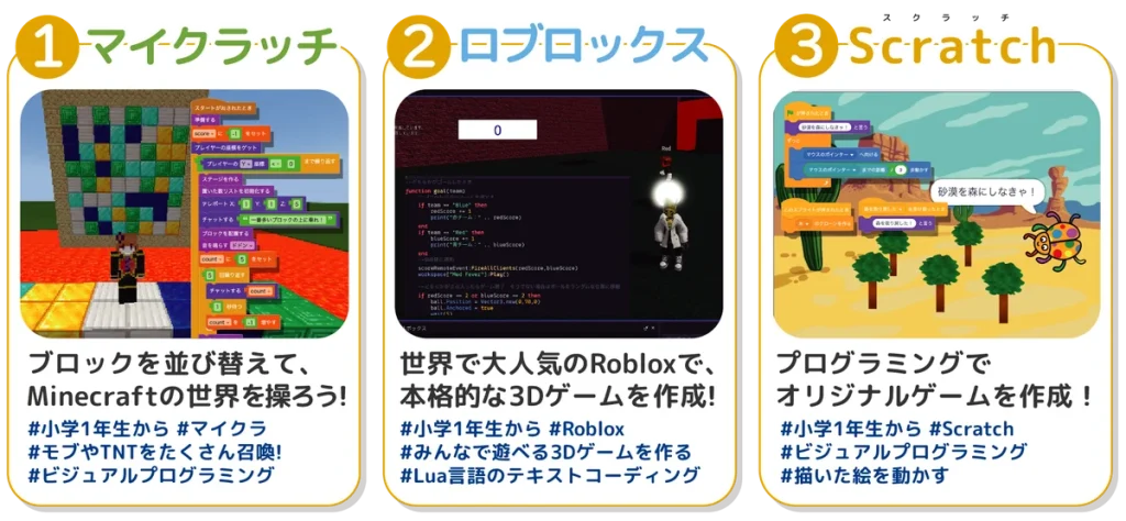 通常のロブロックスのコースでは、Lua言語というプログラミング言語を書く必要がありましたが、今回のロブロックスジュニアコースは、ブロックを並び替えるだけで簡単にコーディングができます。